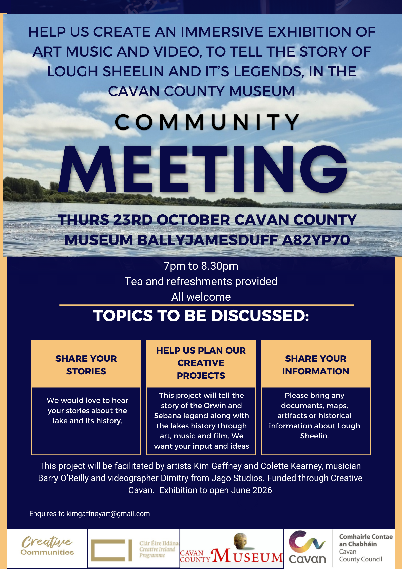 Join us in the museum to help us collect stories about Lough Sheelin - your personal stories, myths and legends, old traditions and any old maps or documents you might have relating to the lake. Tea and refreshments provided - all welcome! This project will tell the story of the Orwin and Sebana legend along with the lakes history through art, music and film. We would love to hear your stories about the lake and its history. Please bring any documents, maps, artifacts or historical information about Lough Sheelin. This project will be facilitated by artists Kim Gaffney Art and Colette Kearney, musician Barry O'Reilly and videographer Dimitry from Jago Studio . Funded through Creative Cavan. Exhibition to open 2026 - enquires to kimgaffneyart@gmail.com